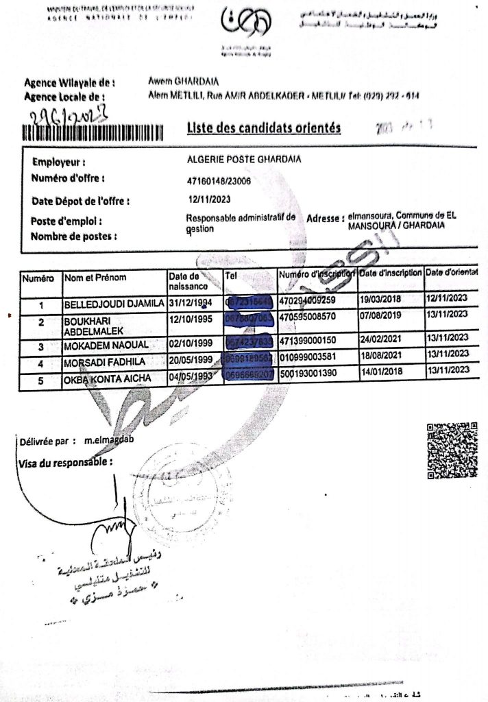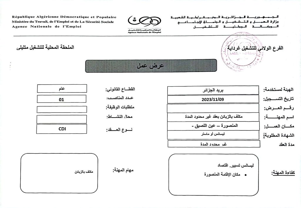 تعلن الملحقة المحلية للتشغيل متليلي عن عرض عمل بمؤسسة بريد الجزائر ALGERIE POSTE كما هو موضح ادناه