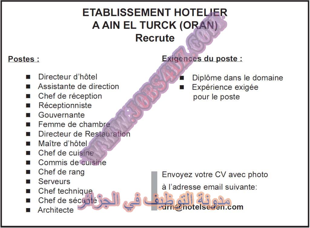 مؤسسة فندقية متواجدة بعين الترك بولاية وهران توظف :