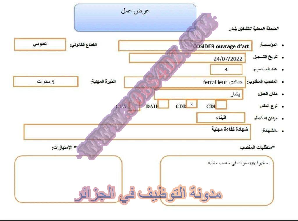 تعلن الملحقة المحلية للتشغيل بشار عن توفر عرض عمل بمؤسسة كوسيدار COSIDER في المناصب المبينة ادناه
