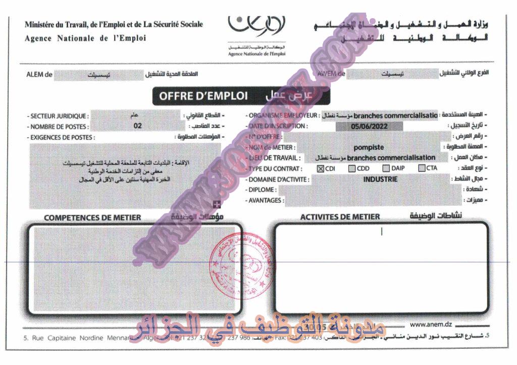 تعلن الملحقة المحلية للتشغيل تيسمسيلت عن توفر عرض عمل بمؤسسة نفطال الفرع التجاري كما هو موضح ادناه