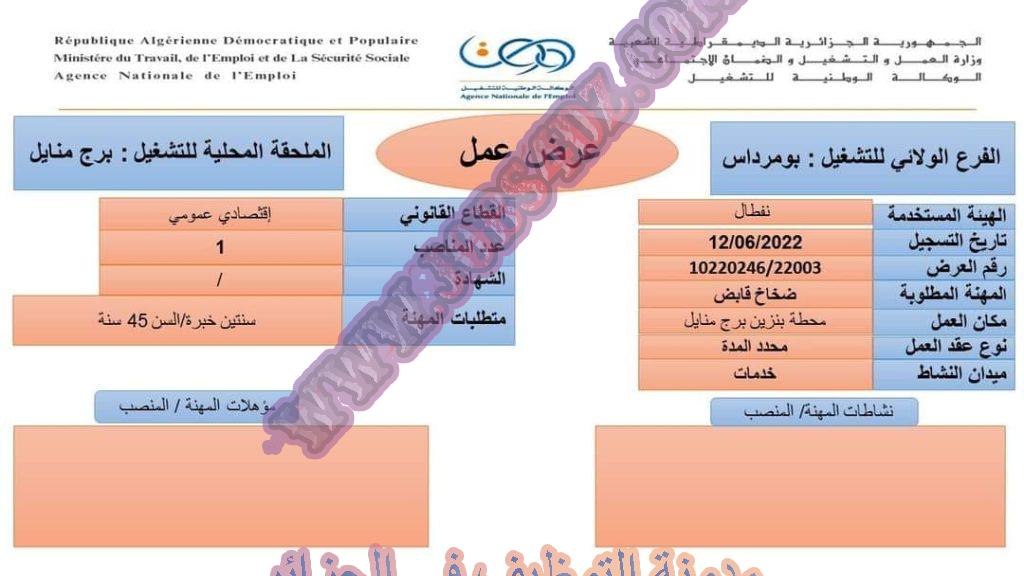 تعلن الملحقة المحلية للتشغيل برج منايل ولاية بومرداس عن توفر عرض عمل بمؤسسة نفطال كما هو موضح ادناه