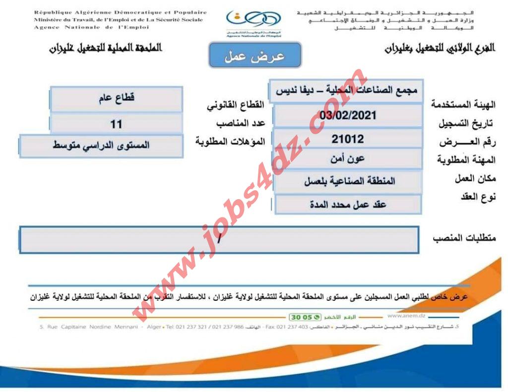 عرض عمل بمجمع الصناعات المحلية ديفانديس غليزان