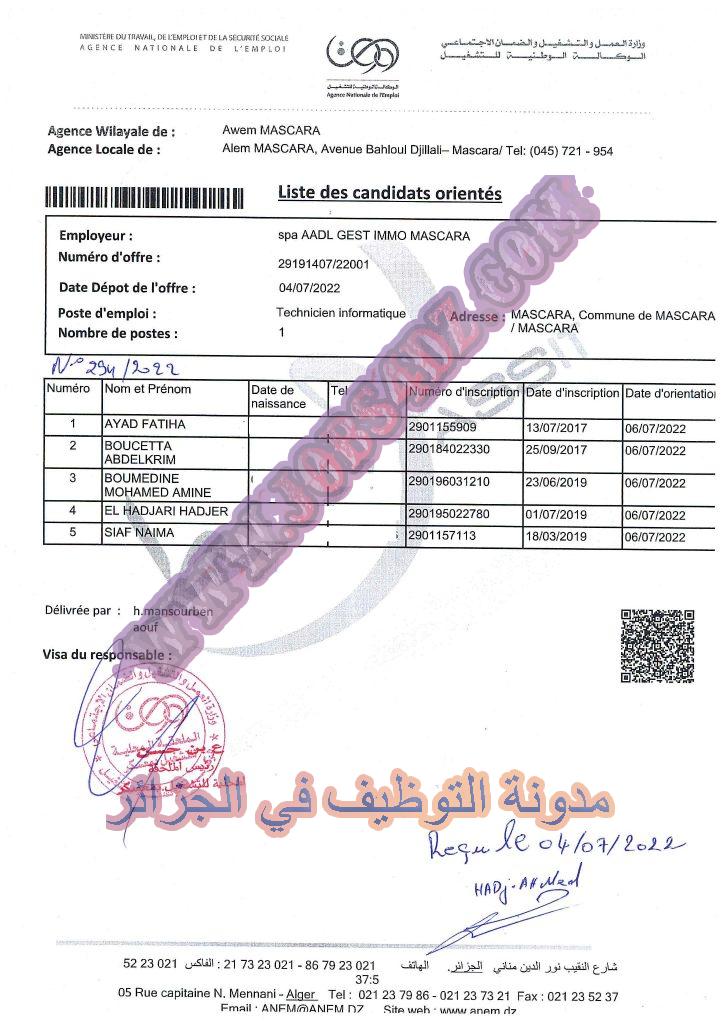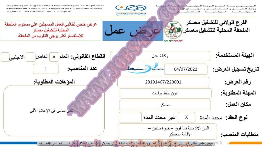 عرض خاص لطالبي العمل المسجلين على مستوى الملحقة المحلية للتشغيل بمعسكر للاستفسار اكثر يرجى التقرب من الملحقة