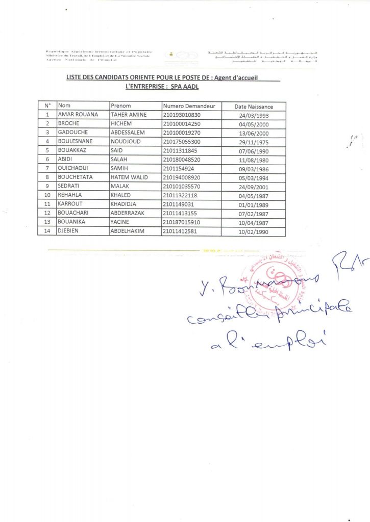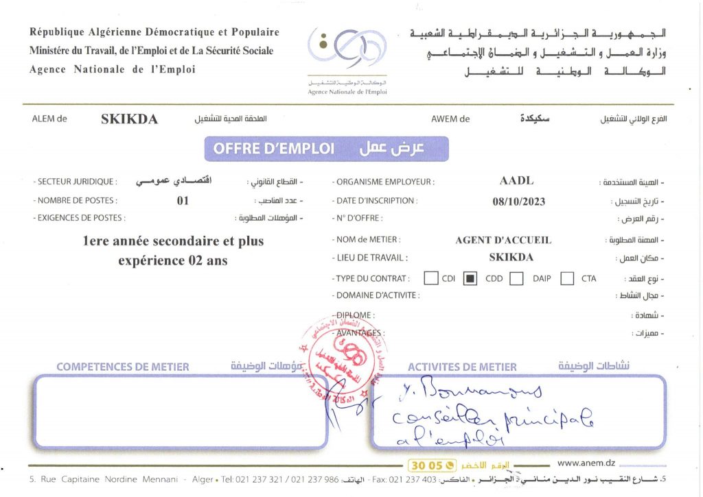 تعلن الملحقة المحلية للتشغيل سكيكدة عرض عمل بوكالة عدل AADL كما هو موضح ادناه