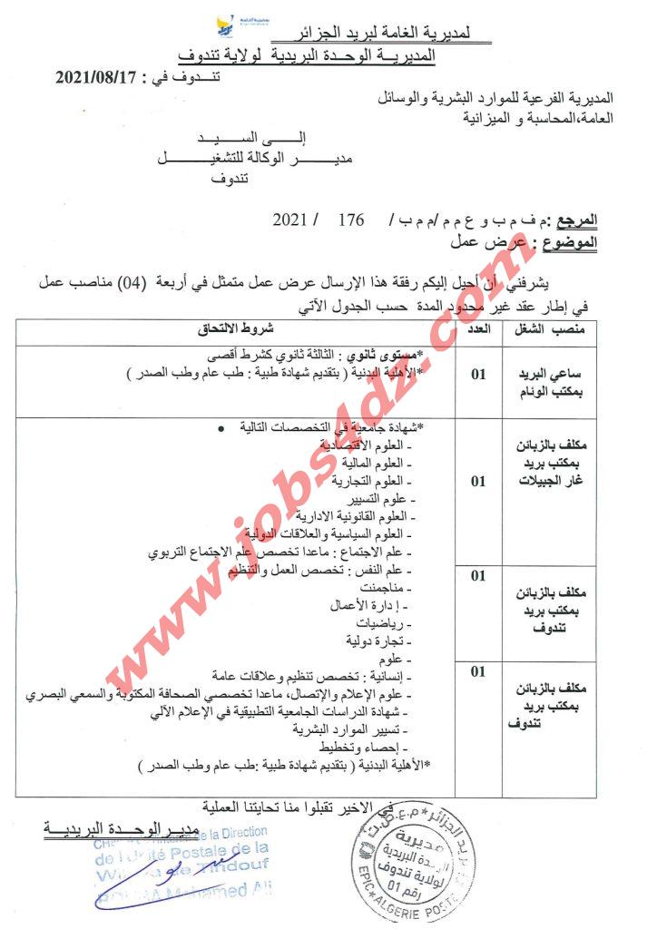 عروض عمل بمؤسسة بريد الجزائر بولايتي بشار وتندوف