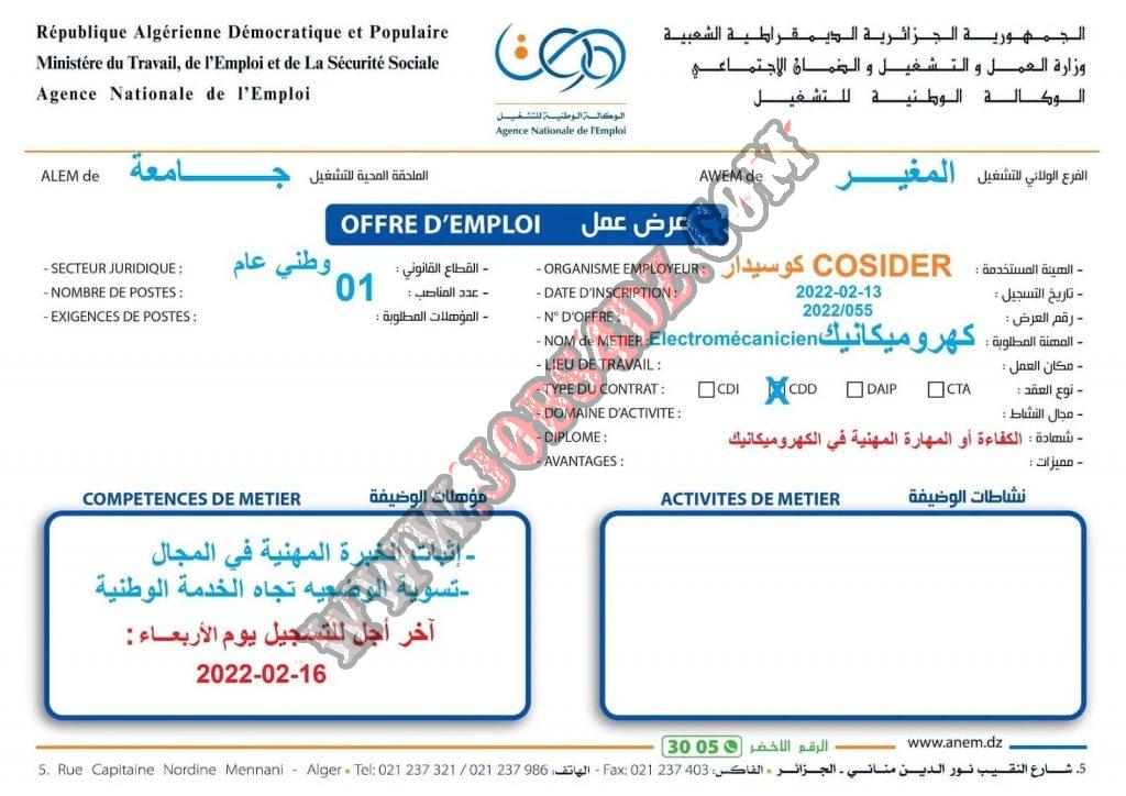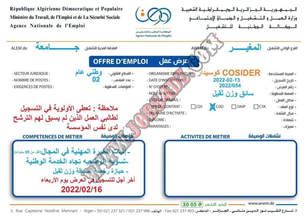 عرض عمل بمؤسسة كوسيدار cosider بولاية المغير