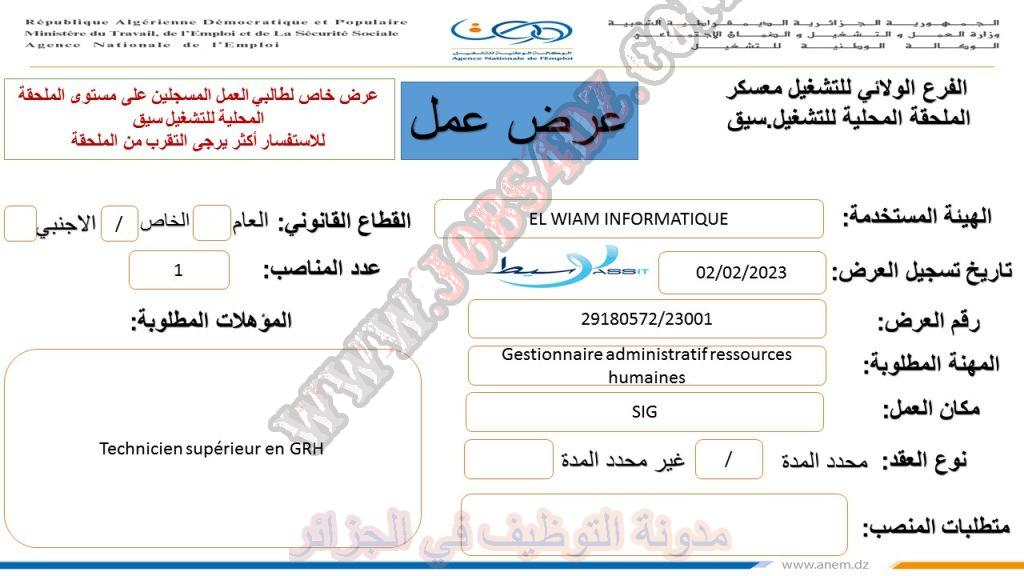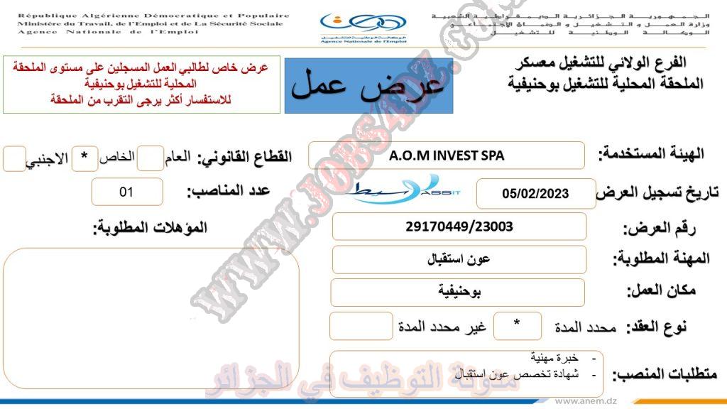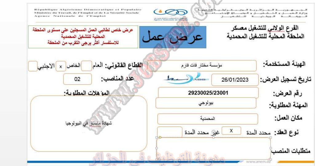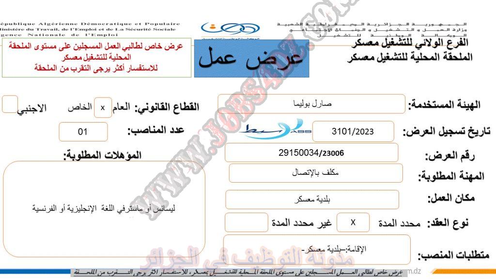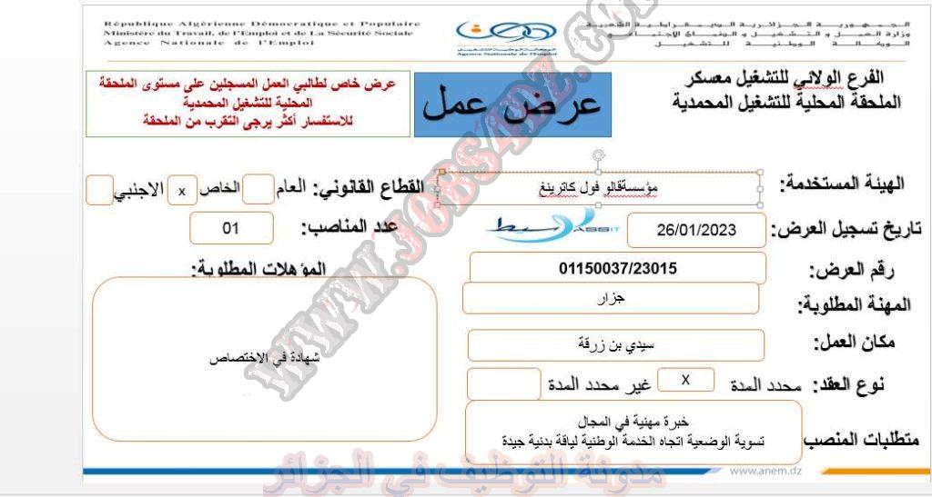 عروض عمل على مستوى ملحقات التشغيل لولاية معسكر في المناصب المبينة ادناه