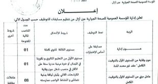 وزارة العمل والتشغيل والضمان الاجتماعي الوكالة الوطنية للتشغيل الملحقة المحلية للتشغيل – جانت ads عرض عمل المؤسسة: المؤسسة العمومية للبث الإذاعي والتلفزي الجزائري TDA المنصب: عون متعدد الخدمات في الأمن تاريخ العرض: 02 / 12 / 2025 مدة صلاحية العرض: 03 أيام نوع العرض: …