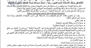 وزارة التعليم العالي والبحث العلمي جامعة محمد بوضياف بالمسيلة المديرية الفرعية للمستخدمين والتكوين ads إعلان عن توظيف و/أو مسابقة على أساس الشهادة للالتحاق بسلك الأساتذة المساعدين، رتبة: أستاذ مساعد قسم “ب” بعنوان سنة 2025 تعلن جامعة محمد بوضياف بالمسيلة عن فتح توظيف و/أو مسابقة …