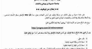 وزارة التعليم العالي والبحث العلمي جامعة حسيبة بن بوعلي بالشلف ads إعلان عن توظيف تعلن جامعة حسيبة بن بوعلي بالشلف عن مسابقة توظيف على أساس الشهادات بعنوان سنة المالية 2025 للالتحاق بسلك الأساتذة المساعدين، رتبة: أستاذ مساعد وذلك وفقاً للشعب والتخصصات المبينة في الجدول …