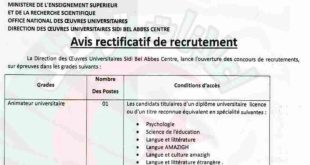 وزارة التعليم العالي والبحث العلمي الديوان الوطني للخدمات الجامعية مديرية الخدمات الجامعية سيدي بلعباس وسط ads إعلان توظيف تعلن مديرية الخدمات الجامعية سيدي بلعباس وسط، عن فتح المسابقات للتوظيف على أساس الاختبارات في الرتب التالية: الرتبةعدد المناصبشروط الالتحاقمنشط جامعي01المترشحون الحائزون على شهادة ليسانس في …