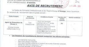 وزارة التكوين المهني و التعليم المهني المركز التكوين المهني و التمهين عزازقة 16 جوان 2025 ads اعلان توظيف يعلن المركز المهني للتكوين و التمهين عزازقة عن فتح باب الترشح للتوظيف في الرتبة التالية: الوظيفةنمط التوظيفشروط القبولعدد المناصبشروط أخرىعون وقاية من المستوى 1 (عقد عمل …