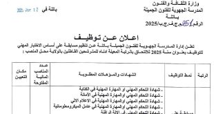 باتنة في 12 جوان 2025 وزارة الثقافة والفنون المدرسة الجهوية للفنون الجميلة باتنة ads إعلان عن توظيف تعلن إدارة المدرسة الجهوية للفنون الجميلة باتنة عن تنظيم مسابقة على أساس الإختبار المهني للتوظيف بعنوان سنة 2025 للالتحاق بالرتبة المبينة أدناه للمترشحين القاطنين بالولاية محل المنصب: …