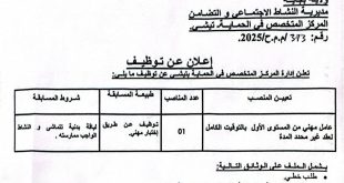 وزارة التضامن الوطني و الأسرة و قضايا المرأة ولاية بجاية مديرية النشاط الاجتماعي و التضامن المركز المتخصص في الحماية بتيشي ads إعلان عن توظيف تعلن إدارة المركز المتخصص في الحماية بتيشي عن توظيف ما يلي: تعيين المنصبعدد المناصبطبيعة المسابقةشروط المسابقةعامل مهني من المستوى الأول …