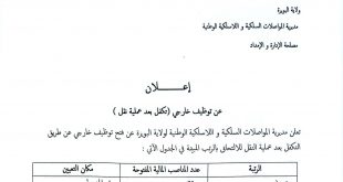ولاية البويرة مديرية المواصلات السلكية واللاسلكية الوطنية مصلحة الإدارة والإعداد إعلان ads عن توظيف خارجي (تكفل بعد عملية نقل) تعلن مديرية المواصلات السلكية واللاسلكية الوطنية لولاية البويرة عن فتح توظيف خارجي عن طريق التكفل بعد عملية النقل للالتحاق بالرتب المبينة في الجدول الآتي: الرتبةعدد …