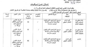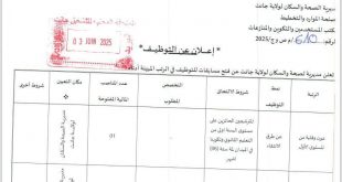 اعلانات توظيف الولايات المعنية: الجزائر العاصمة، تيبازة، بومرداس، البليدة، تيزي وزو، بجاية، برج بوعريريج، قسنطينة، الشلف، سيدي بلعباس، تلمسان، المسيلة، ايليزي، غليزان، سكيكدة، باتنة، الطارف وبسكرة يرجى من المهتمين التقرب من الادارة المعنية بالعرض او الملحقة المحلية للتشغيل حسب طبيعة الاعلان ads المجمع المدرسي …