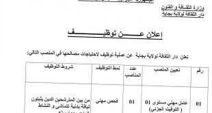 وزارة الثقافة و الفنون دار الثقافة لولاية بجاية ads إعلان عن توظيف تعلن دار الثقافة لولاية بجاية عن عملية توظيف لاحتياجات مصالحها في المنصب التالي: رقمتعيين المنصبعدد المناصبنمط التوظيفشروط التوظيف01عامل مهني مستوى 01 (التوقيت الجزئي)01فحص مهنيمن بين المترشحين الذين يثبتون لياقة بدنية تتماشى و …