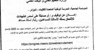 وزارة التعليم العالي و البحث العلمي المؤسسة الجامعية: المدرسة الوطنية المتعددة التقنيات – الجزائر – ads إعلان عن توظيف و / أو مسابقة على أساس الشهادات للإلتحاق بسلك الأساتذة المساعدين، رتبة: أستاذ مساعد تعلن المدرسة الوطنية المتعددة التقنيات – الجزائر – عن توظيف و/أو …