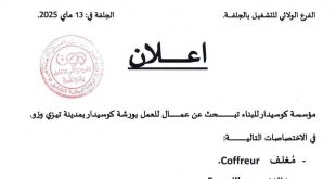 وزارة العمل والتشغيل والضمان الاجتماعي الوكالة الوطنية للتشغيل الفرع الولائي للتشغيل بالجلفة. ads إعلان مؤسسة كوسيدار للبناء تبحث عن عمال للعمل بورشة كوسيدار بمدينة تيزي وزو. في الاختصاصات التالية: مغلف Coiffeur. حدائدي Ferrailleur. الشروط المطلوبة: خبرة مهنية لمدة سنتين. التمتع بلياقة بدنية. لمن يهمهم …