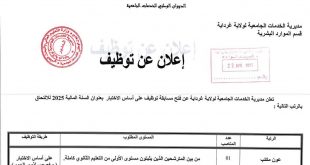 وزارة التعليم العالي والبحث العلمي الديوان الوطني للخدمات الجامعية مديرية الخدمات الجامعية لولاية غرداية ads إعلان عن توظيف تعلن مديرية الخدمات الجامعية لولاية غرداية عن فتح مسابقة توظيف على أساس الاختبار بعنوان السنة المالية 2025 للالتحاق بالرتبة التالية: الرتبةعدد المناصبالمستوى المطلوبطريقة التوظيفعون مكتب01من بين …