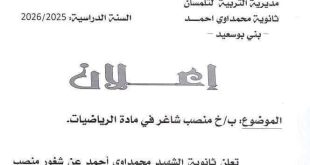 وزارة التربية الوطنية مديرية التربية لتلمسان ثانوية محمداوي احمد – بني بوسعيد ads السنة الدراسية: 2026/2025 إعــــــلان الموضوع: ب/خ منصب شاغر في مادة الرياضيات. تعلن ثانوية الشهيد محمداوي أحمد عن شغور منصب الرياضيات و تدعو الحاصلين على شهادة الماستر في الرياضيات التقدم الى الثانوية …