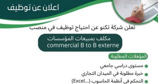 إعلان عن توظيف ads تعلن شركة تكنو عن احتياج توظيف في منصب: مكلف بمبيعات المؤسسات commercial B to B externe المؤهلات المطلوبة: مستوى دراسي جامعي خبرة مطلوبة في الميدان التجاري التحكم في أنظمة الحاسوب (Excel…) مستوى جيد في اللغة الفرنسية رخصة سياقة صنف ب- …
