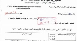 وزارة الفلاحة والتنمية الريفية والصيد البحري ديوان تنمية الزراعة الصناعية بالأراضي الصحراوية رئيس الفرع الولائي للتغيل – المنيعة – ads في: 10 أفريل 2025 عرض عمل عرض العمل مطلوب بالشروط التالية: الرقمالرتبة/منصب الشغلالعددشروط العرض01رئيس قسم الوسائل العامة01– شهادة ماستر في إدارة الأعمال، المحاسبة والمالية، …