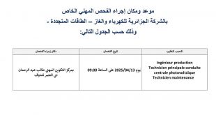 وزارة العمل والتشغيل والضمان الاجتماعي الوكالة الوطنية للتشغيل ads موعد ومكان إجراء الفحص المهني الخاص بالشركة الجزائرية للكهرباء والغاز – الطاقات المتجددة – وذلك حسب الجدول التالي: المنصب المطلوبتاريخ الامتحانمكان إجراء الامتحانمهندس إنتاج13/04/2025 على الساعة 09:00مركز التكوين المهني طالب عبد الرحمان حي النصر تندوفتقني …