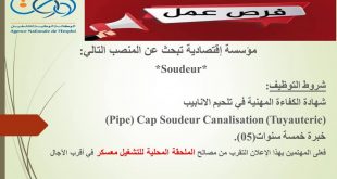 فرص عمل الوكالة الوطنية للتشغيل Agence Nationale de l’Emploi ads مؤسسة اقتصادية تبحث عن المنصب التالي: Soudeur شروط التوظيف: شهادة الكفاءة المهنية في تلحيم الأنابيب (Pipe) Cap Soudeur Canalisation (Tuyauterie) خبرة خمسة سنوات (05). فعلى المهتمين بهذا الإعلان التقرب من مصالح الملحقة المحلية للتشغيل …