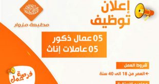 إعلان توظيف مطبعة مزوار ولاية الوادي ads 05 عمال ذكور 05 عاملات إناث شروط العمل العمر من 18 إلى 40 سنة مواعيد الاستقبال من السبت إلى الخميس من 8:00 إلى 13:00 رقم الهاتف 05.55.62.88.50 الموقع قرب جامعة الشهيد حمة لخضر ملاحظة على الراغبين التقدم …