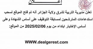 مديرية التربية لشرق ولاية الجزائر ads إعلان تعلن مديرية التربية لشرق ولاية الجزائر أنه تم فتح الموقع لسحب استدعاءات المترشحين لمسابقة التوظيف على أساس الشهادة وعلى أساس الإختبار ابتداء من يوم 2025/02/06 من الموقع المبين في الصورة التالية: مديرية التربية تفتح مسابقة توظيف العمال …