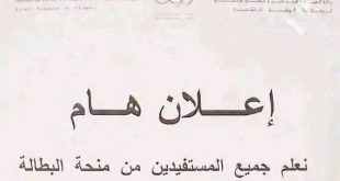 الجمهورية الجزائرية الديمقراطية الشعبية وزارة العمل و التشغيل و الضمان الاجتماعي الوكالة الوطنية للتشغيل ads إعلان هام نعلم جميع المستفيدين من منحة البطالة أن عملية تجديد بطاقة طالب العمل إلزامي قبل انتهاء الصلاحية الموضحة بتاريخ إلغاء الطلب حتى لا تلغى المنحة، تجدون تاريخ الإلغاء …