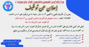 مركز التكوين المهني والتمهين الرائد جابر مغنية ads إعلان عن توظيف يعلن مركز التكوين المهني والتمهين الرائد جابر مغنية 01 عن توظيف على أساس الاختبار للالتحاق بمنصب: أستاذ متخصص في التكوين والتعليم المهنيين من الرتبة الأولى (في الحقوق، علوم قانونية وإدارية) فعلى المترشحين الحائزين …
