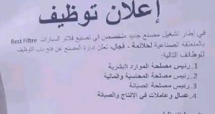 إعلان توظيف ads في إطار تشغيل مصنع جديد متخصص في تصنيع فلاتر السيارات Best Filtre بالمنطقة الصناعية لحلائمة – قجال، تعلن إدارة المصنع عن فتح باب التوظيف للوظائف التالية: رئيس مصلحة الموارد البشرية رئيس مصلحة المحاسبة والمالية رئيس مصلحة الصيانة عمال وعاملات في الإنتاج …