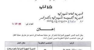 وزارة المالية المديرية العامة للميزانية المديرية الجهوية للميزانية بالجزائر ads الجزائر في: 14 سبتمبر 2025 إعـــــــــــــلان يعلن السيد المدير الجهوي للميزانية بالجزائر عن حاجة مصالحه إلى تدعيم عن طريق عملية النقل في حدود المناصب المالية المفتوحة ضمن الجدول أدناه: الرتبالمناصب المفتوحةمكان العملمهندس دولة في …