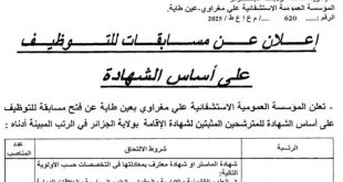 وزارة الصحة مديرية الصحة لولاية الجزائر البليدة في: 2025/09/16 ads إعــــلان عن مســـــــابقة للتــــــــــــــوظيف على أساس الشهادة تعلن المؤسسة العمومية الاستشفائية على مستوى عين طاية عن فتح مسابقة للتوظيف على أساس الشهادة للمرشحين المثبتين لشهادة الإقامة بولاية الجزائر في الرتب المبينة أدناه: متصرف محلل …