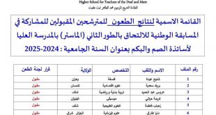 اعلان المدرسة العليا لأساتذة الصم والبكم ads القائمة الاسمية لنتائج الطعون للمترشحين المقبولين للمشاركة في المسابقة الوطنية للالتحاق بالطور الثاني (الماستر) بالمدرسة العليا لأساتذة الصم والبكم جميع مسابقات وإعلانات التوظيف نوفمبر 2025 إعلان عن مسابقة توظيف بالمعهد التقني لزراعة البقول والزراعات الصناعية بالجزائر العاصمة …