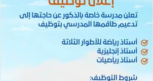 إعلان توظيف ads تعلن مدرسة خاصة بالذكور عن حاجتها إلى تدعيم طاقمها المدرسي بتوظيف أستاذ رياضة للأطوار الثلاثة أستاذ إنجليزية أستاذ رياضيات شروط التوظيف: شهادة في الاختصاص الإقامة في باب الزوار وضواحيها لياقة بدنية والقدرة على شرط وتأطير التلاميذ ترسل السير الذاتية إلى الايميل …