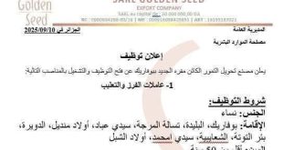 إعلان توظيف ads يعلن مصنع تحويل التمور الكائن مقره الجديد ببوفاريك عن فتح التوظيف والتشغيل بالمناصب التالية: 1- عاملات الفرز والتعليب شروط التوظيف: الجنس: نساء الإقامة: بوفاريك، البليدة، تسالة المرجة، سيدي عياد، أولاد منديل، الدويرة، بئر التوتة، الشعايبية، سيدي امحمد، أولاد الشبل. السن: أقل …