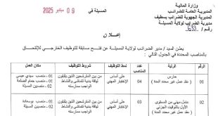 وزارة المالية المديرية العامة للضرائب المديرية الجهوية للضرائب بسطيف مديرية الضرائب لولاية المسيلة ads المسيلة في 09 سبتمبر 2025 إعلان يعلن مدير الضرائب لولاية المسيلة عن فتح مسابقة للتوظيف الخارجي للإلتحاق بالمناصب المحددة في الجدول التالي : الرتبة: حارس (عقد عمل غير محدد المدة) …