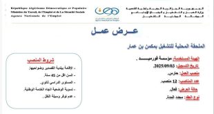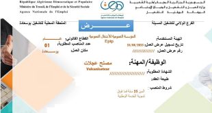 وزارة العمل والتشغيل والضمان الاجتماعي الوكالة الوطنية للتشغيل الفرع الولائي للتشغيل المسيلة ads الجهة المستخدمة: Eptp تاريخ تسجيل عرض العمل: 24/08/2025 المناصب المطلوبة: كهربائي آليات (Electricien engins) تقني سامي في الإعلام الآلي تقني سامي في الإلكتروميكانيك مصلح عجلات (Vulcanisateur) ميكانيكي وزن ثقيل (Mécanicien poids …
