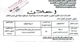 وزارة التكوين و التعليم المهنيين مركز التكوين المهني و التمهين الحمامات ads إعـــلان تعلن إدارة مركز التكوين المهني و التمهين الحمامات ولاية تبسة، عن فتح مسابقة على أساس الإختبار المهني المبين أدناه: منصب الشغل: حارس غير محدد المدة بالتوثيق الكامل نمط التوظيف: مسابقة على …