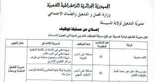 وزارة العمل و التشغيل و الضمان الاجتماعي مديرية التشغيل لولاية المسيلة ads إعلان عن مسابقة توظيف تعلن مديرية التشغيل لولاية المسيلة عن فتح مسابقة للتوظيف في المناصب المبينة في الجدول أدناه: الرتبةعدد المناصب المفتوحةنمط التوظيفشروط الالتحاقمكان التعيينكاتب مديرية01مسابقة على أساس الشهادة– شهادة تقني في …