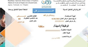 وزارة العمل و التشغيل و الضمان الاجتماعي الوكالة الوطنية للتشغيل الملحقة المحلية للتشغيل بالثنية ads إعلان عن عروض العمل في المؤسسات الاقتصادية لطالبي العمل للترشح 01-مصرح جمارك (منصب واحد) (Déclarant en douane) شروط الالتحاق بالمنصب: خبرة لا تقل عن 01 سنة في ميدان الجمارك …