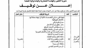 وزارة العمل و التشغيل و الضمان الاجتماعي الوكالة الوطنية للتشغيل الملحقة المحلية للتشغيل بالجلفة الجلفة في: 2025/09/02 ads إعلان مؤسسة عمومية تبحث عن مرشحين لشغل منصب: مختص في تصليح الآلات الكهرومنزلية متطلبات المنصب: خبرة مهنية في تصليح الآلات الكهرومنزلية. السن أقل من 40 سنة. …