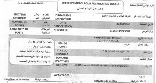 وزارة العمل والتشغيل والضمان الاجتماعي الوكالة الوطنية للتشغيل الملحقة المحلية للتشغيل عزابة فرع الولائي للتشغيل سكيكدة ads عرض عمل للترشح المحلي الهيئة المستخدمة / الشركة الجزائرية للتأمينات CAAT تاريخ التسجيل 2025/09/02 المهنة المطلوبة Chargé d’études Niveau 1 مكلف بالدراسات مستوى 1 مكان العمل عزابة …