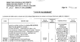 مسابقة توظيف مديرية الغابات والحزام الأخضر لولاية الجزائر ads تعلن مديرية الغابات والحزام الأخضر لولاية الجزائر عن فتح مسابقة على أساس الاختبار للالتحاق بالرتب المبينة أدناه :المنصب المطلوب : مفتش رئيسي للغاباتعدد المناصب المالية المفتوحة : 02شروط المشاركة :• المترشحون الحائزون على شهادة ليسانس …