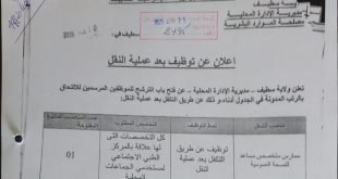 وزارة الداخلية والجماعات المحلية والتهيئة العمرانية مديرية الإدارة المحلية ولاية سطيف ads سطيف في: 25 أوت 2025 إعلان عن توظيف بعد عملية النقل تعلن ولاية سطيف – مديرية الإدارة المحلية – عن فتح باب الترشح للموظفين المرسمين للالتحاق بالرتب المدونة في الجدول أدناه وذلك …