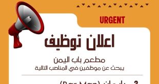 عاجل (URGENT) إعلان توظيف ads مطعم باب اليمن يبحث عن موظفين في المناصب التالية 3 بارمان (Bar Man) 15 نادل (Serveurs) 2 عاملات نظافة 4 غسّالي صحون (Plongeurs) 2 Caissiers على المهتمين التفضل بالحضور إلى المطعم مصحوبين بالسيرة الذاتية الخاصة بهم 0542 48 48 …
