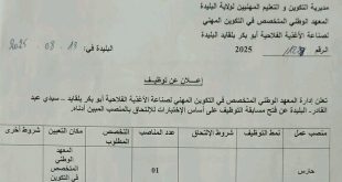 وزارة التكوين و التعليم المهنيين مديرية التكوين و التعليم المهنيين لولاية البليدة المعهد الوطني المتخصص في التكوين المهني لصناعة الأغذية الفلاحية أبو بكر بلقايد البليدة البليدة في: 13. 08. 2025 ads إعلان عن توظيف تعلن إدارة المعهد الوطني المتخصص في التكوين المهني لصناعة الأغذية …